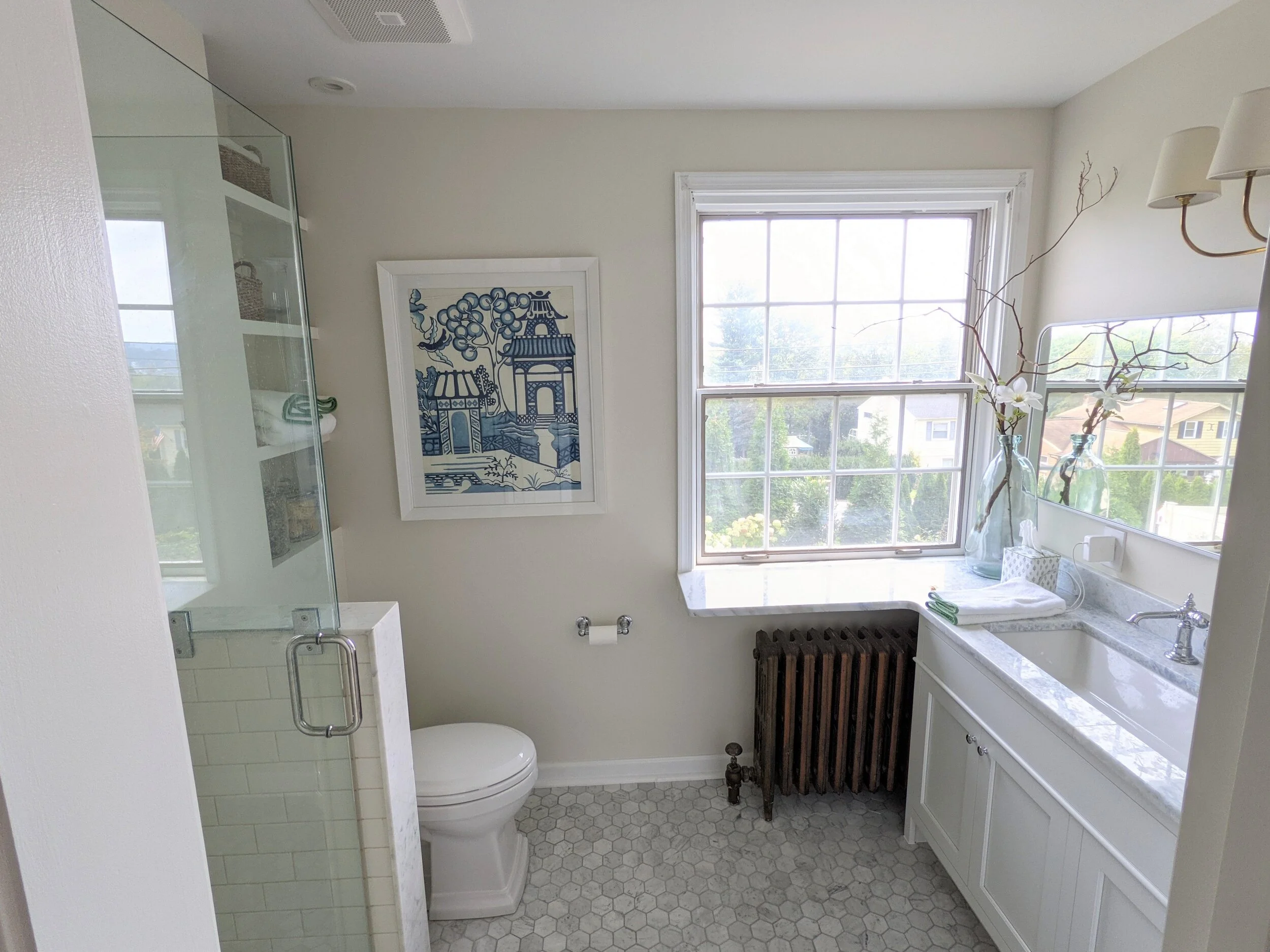 Opposite the sink, our shower and toilet now share a wall with the hall bath. The toilets are back-to-back, which made plumbing much easier. The biscuit subway tile is from Home Depot and the Carrera White Marble 3” Hexagon floor tile is from Stone Center Online.
