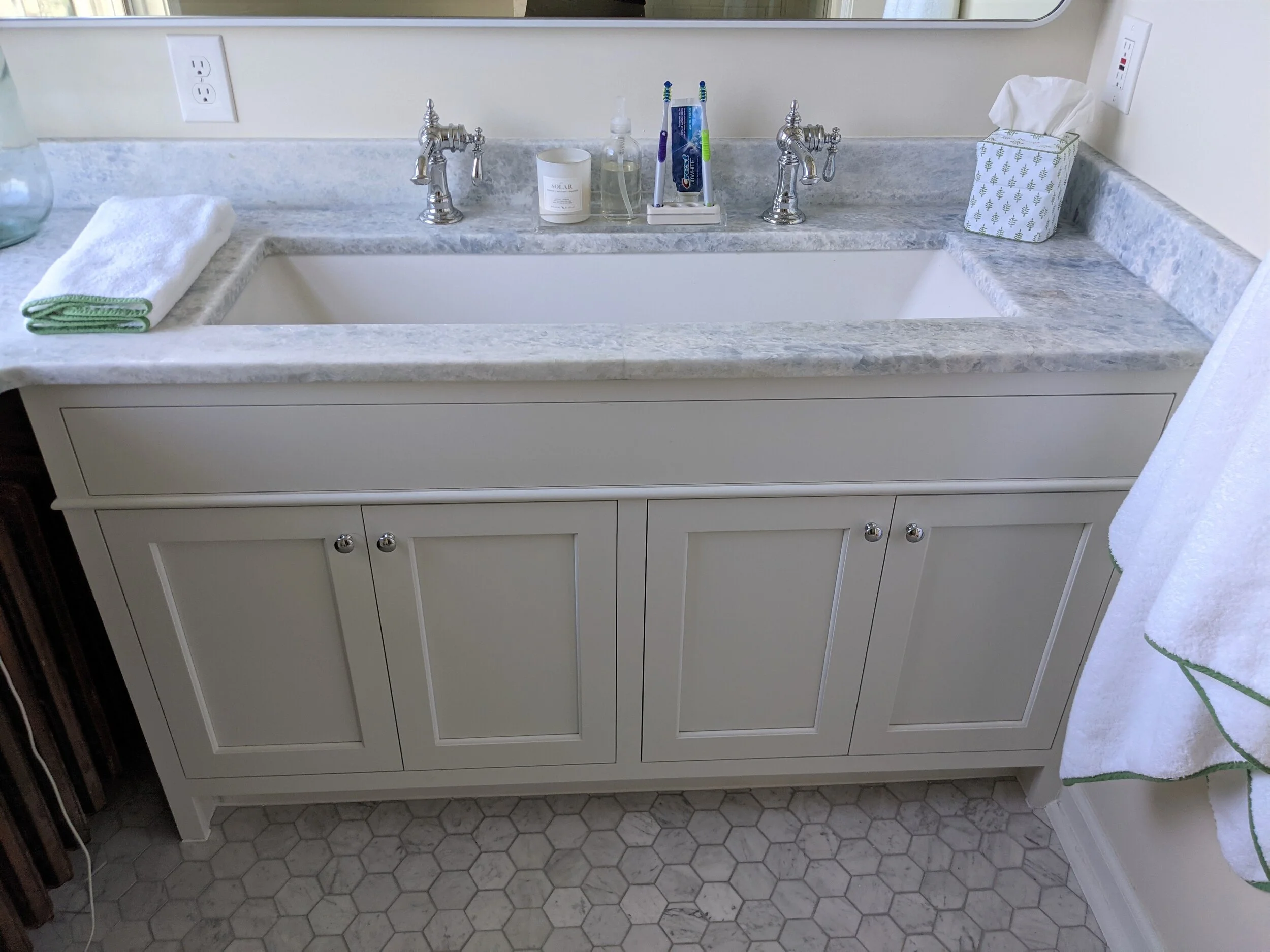 We ended up wrapping the countertop above the radiator to allow for extra countertop space. This was important because our oversized sink took up much of the righthand countertop. I love having extra room for my hair dryer, makeup, etc. while getting ready!