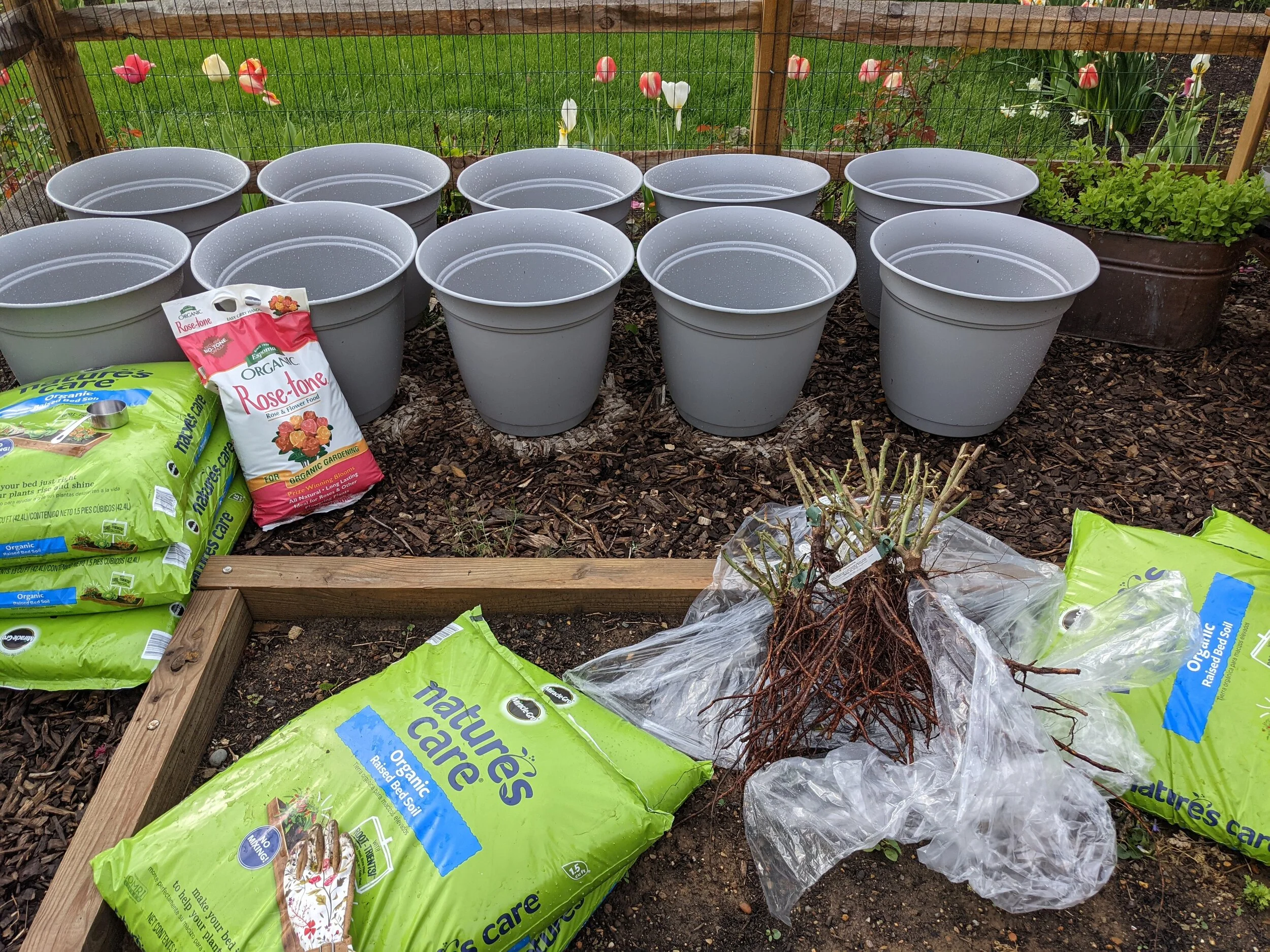 After soaking my roses overnight in our new guest bathroom tub, I got to work potting them. (When Alex saw the roses in the bathtub, he lectured me on how my hobbies might be getting out of hand haha!) I purchased 12 bags of Nature’s Care Organic Raised Bed Soil (I couldn’t find potting soil and thought this was close enough) and 1 bag of Organic Rose-tone. I mixed in a generous scoop of Rose-tone with the potting soil in each pot and tucked the soil around the roots of the rose.