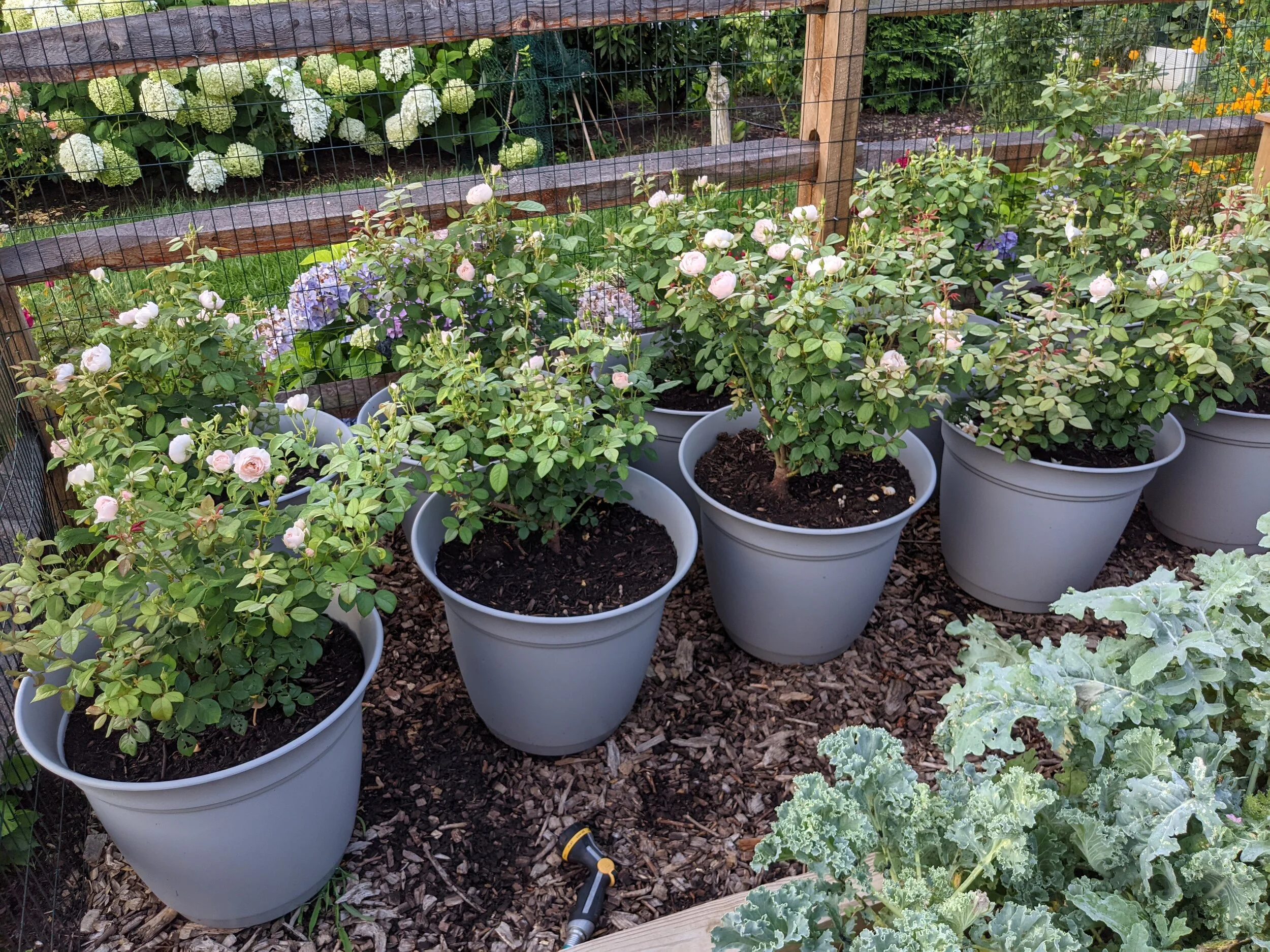 With consistent watering and a healthy feeding of MaxSea Plant Food (a Grace Rose Farm Instagram recommendation and my new favorite, although it is in limited supply and so hard to find), my roses are now flourishing! I even disbudded them to encourage root growth but we left town for two weeks and when I returned they were blooming like crazy!
