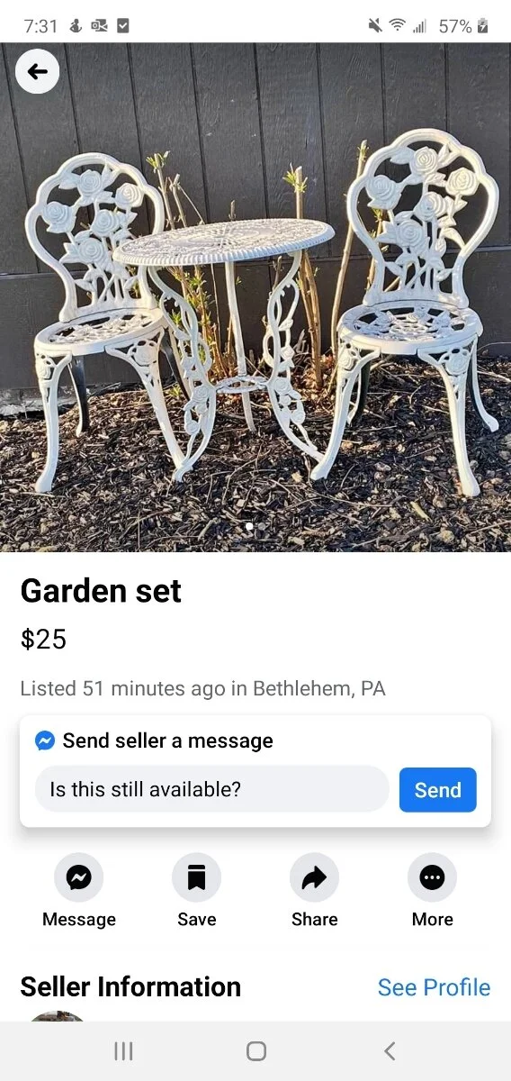 I have been scouring Facebook Marketplace for a bistro set to put in the vegetable garden in place of the wrought iron bench which you see in my photo above. I’d like that bench, which was my Grandmother’s, to go outside the garden on the left-hand side. I plan to plant roses on either side of the gate.
